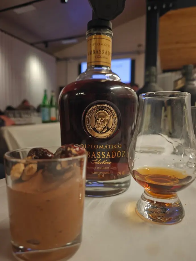 De Diplomatico Ambassador hebben we gecombineerd met een chocolademousse, getopt met gekarameliseerde amandelen. Ook dit was weer een topmoment. Voor velen bleef deze rum jammer genoeg onder de hoge verwachting. Sommigen vonden dat de rum niet echt in het rijtje van Diplomatico hoorde. Uiteraard kan je niet discussiëren over smaak. Hoe dan ook: deze rum verdient zeker de titel 'vlaggenschip'!